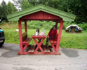 Akşamleyin Honefoss’a gelmeden Hamremoen’i geçince Rishoved öncesi bir yerde , yol kenarında konakladık. . Burada birkaç karavan da konaklıyor. Biz de çadırımızı çimenlerin üzerine kurduk. Çimenler çok ıslaktı. Zaten gece de yağmur yağdı. Neyse ki çadırımız su geçirmiyor. Ama çadırımızı kurarken çadırımızın bazı bölümlerinin simsiyah küflendiğini farkettik. Dün gece çadır kurmayıp arabada yatmıştık. Önceki gece de sabaha kadar yağmur yağdığından ıslak ıslak toplamıştık. Tabii ki çadır da haklı olarak küflendi. Konaklama yerimizde altında yemek yiyebileceğimiz, üzeri çatı gibi bir yapıyla kapalı ahşap bir masa da var. Yani bir çardak.